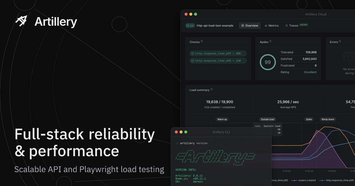 The complete load testing platform. Everything you need for production-grade load tests. Serverless & distributed. Load test with Playwright. Load test HTTP APIs, GraphQL, WebSocket, and more. Use any Node.js module.
